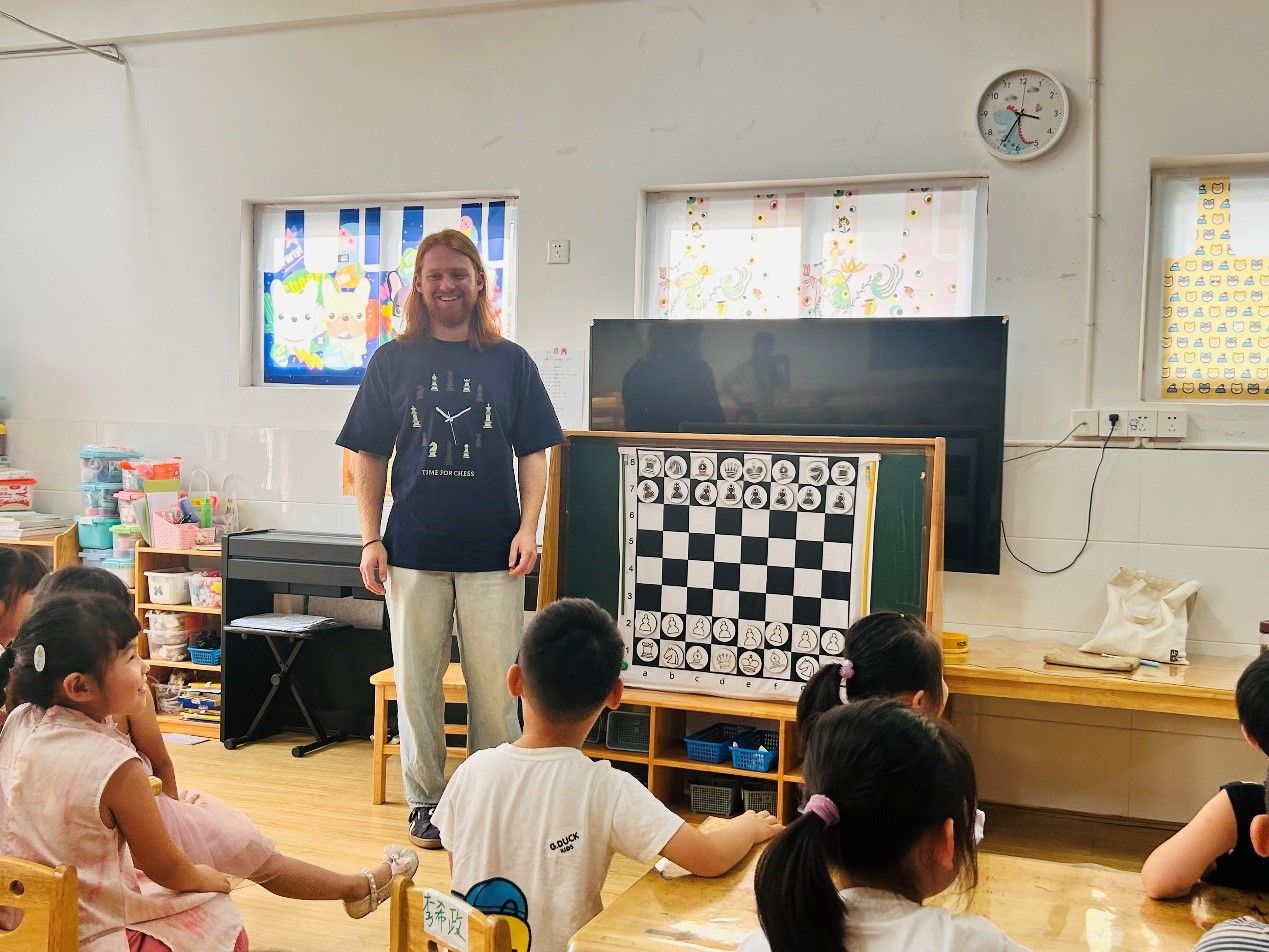 路易斯则以趣味棋局为切入点,用严谨又不失活泼的讲解,让大家感受到国际象棋的逻辑魅力。路易斯用专业与热情赢得师生、家长的一致欢迎。