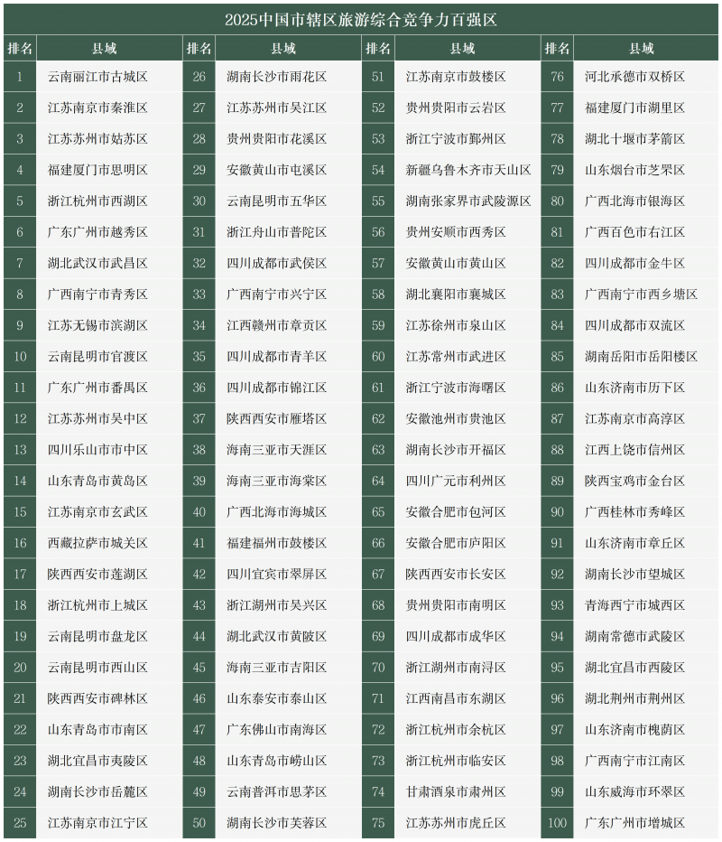 《报告》显示,2025中国旅游百强区覆盖全国20个省份。其中,江苏以12席领跑全国,四川、浙江、山东并列第二,各占9席,共同构成百强区的核心阵营。