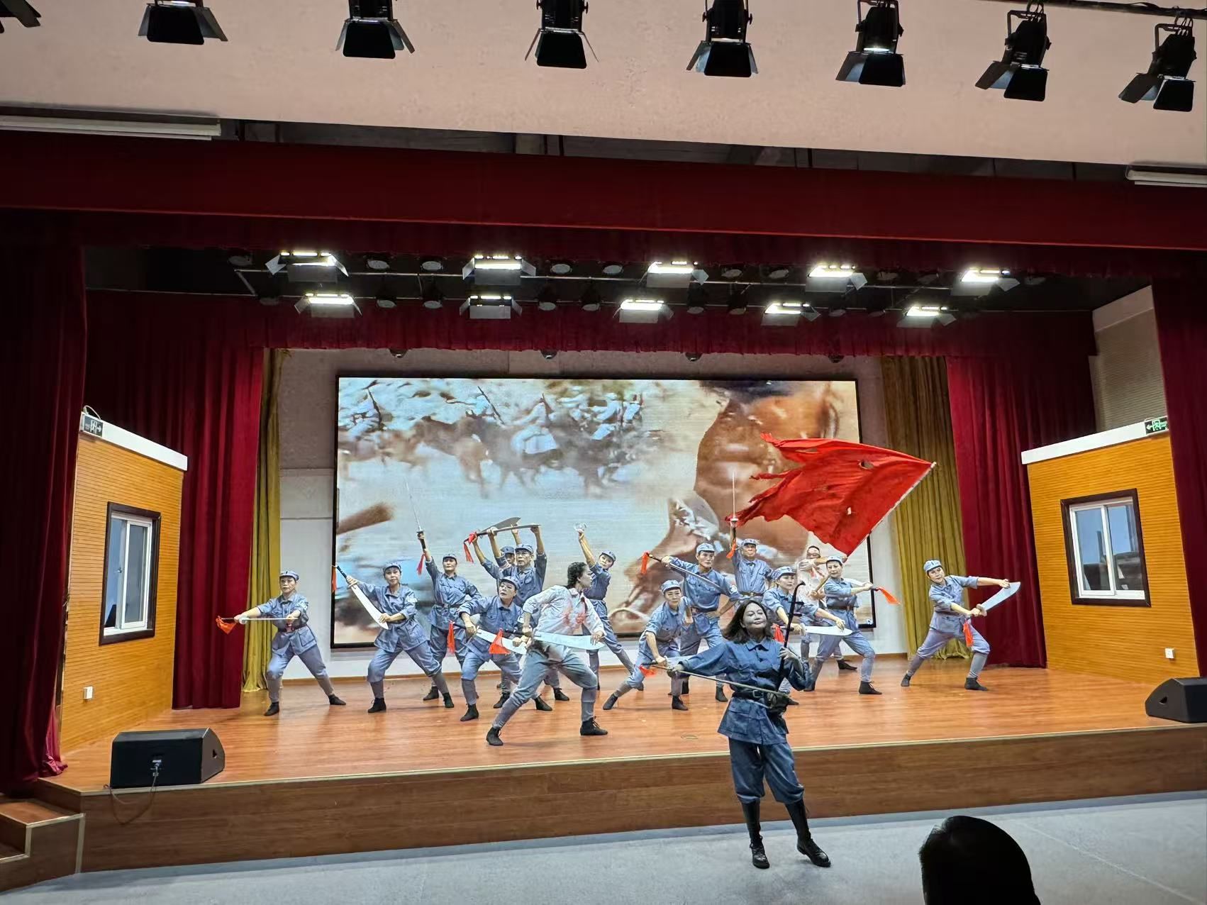 小合唱《游击队歌》旋律轻快却不失力量,生动刻画了游击健儿灵活作战、机智抗敌的鲜活形象;二胡独奏《战马奔腾》以激昂高亢的曲调,仿佛让观众看到了战马嘶鸣、将士冲锋的壮阔场景,尽显中华儿女的英雄气概。现代京剧《沙家浜》“智斗” 选段韵味醇厚,通过精彩的唱念做打,再现了抗战时期地下工作者与敌人斗智斗勇的经典桥段,赢得满堂喝彩。