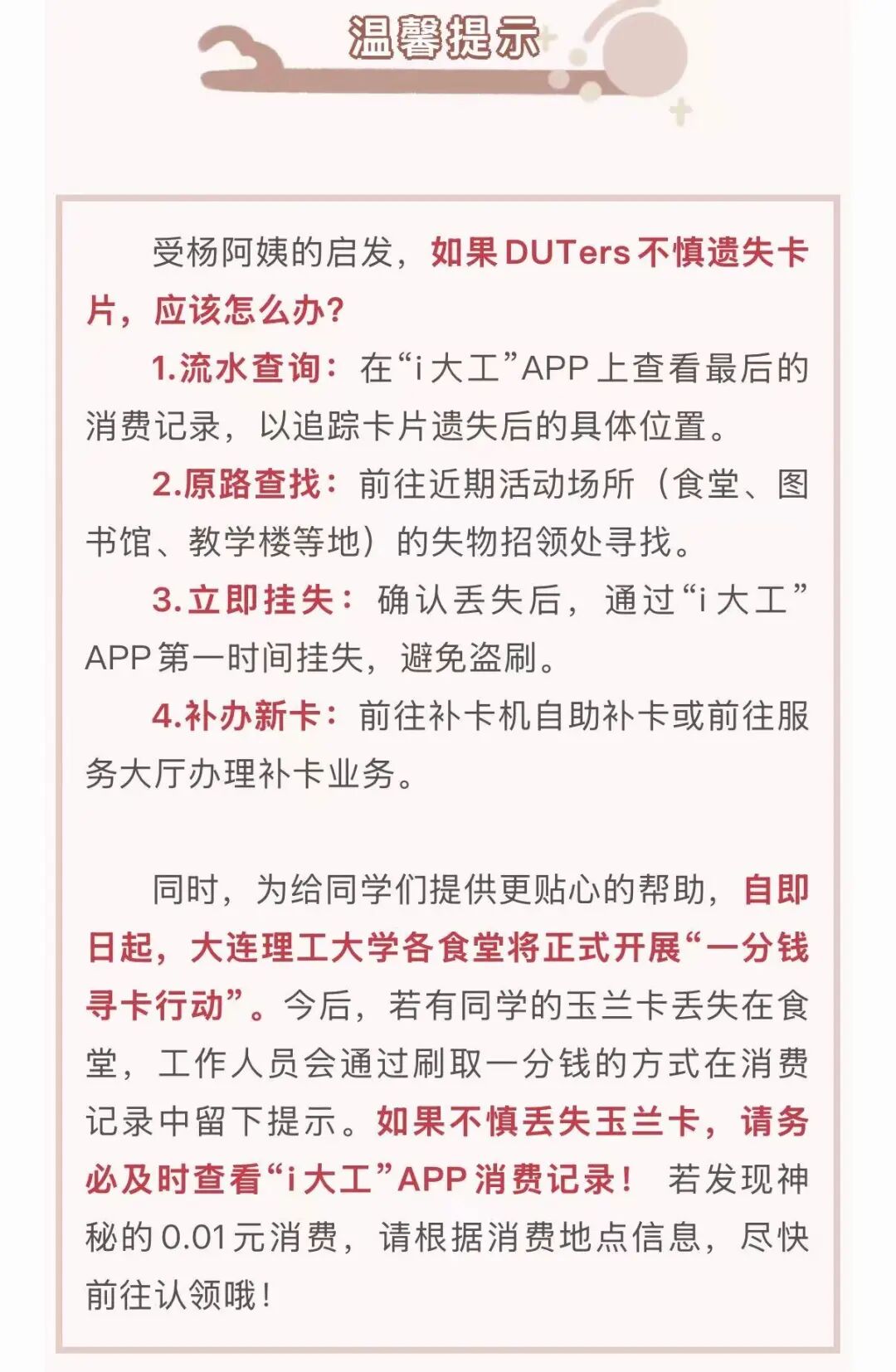 自即日起,大连理工大学各食堂将正式开展“一分钱寻卡行动”。今后,若有同学的玉兰卡丢失在食堂,工作人员会通过刷取一分钱的方式在消费记录中留下提示。