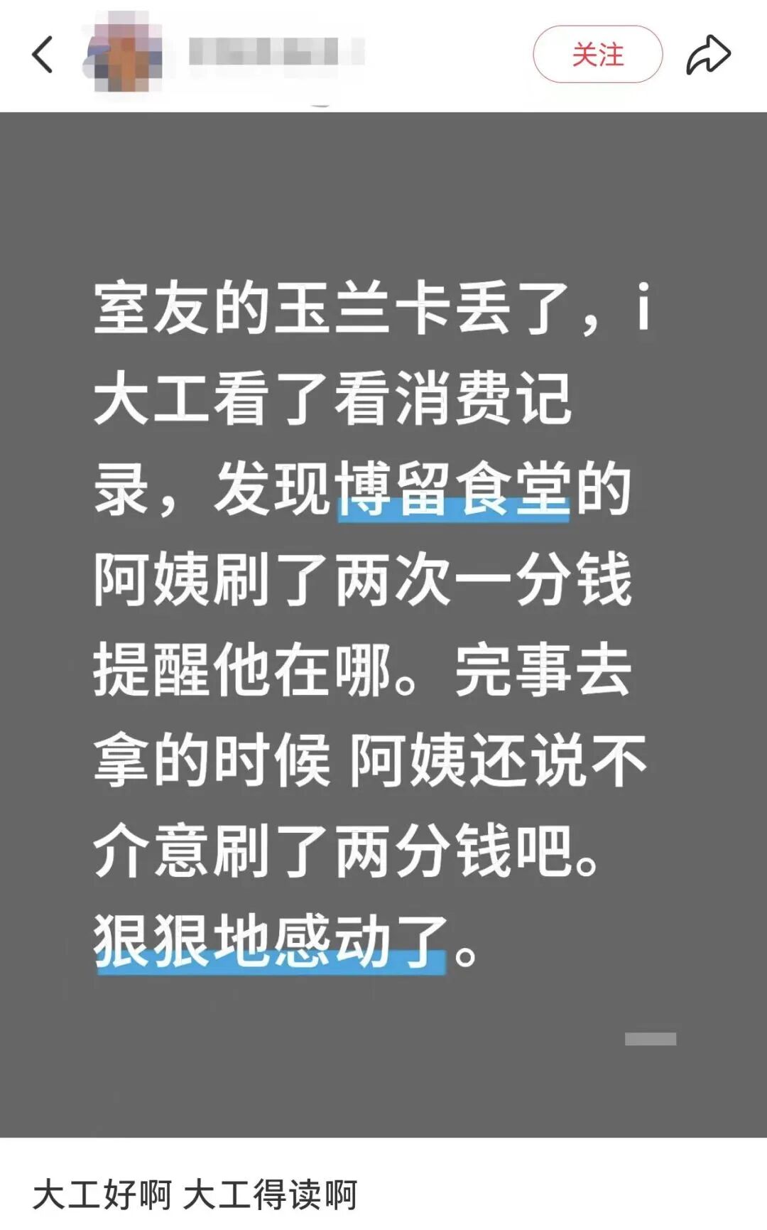 原来,是食堂阿姨在捡到卡后,通过刷极小金额的方式留下消费记录,用这种巧妙的方式提醒同学卡片所在的位置。