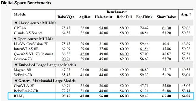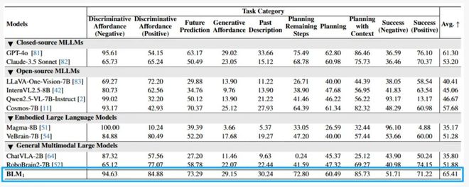 BLM-1.0 在六大数字空间评测中,包含具身任务推理、导航规划、功能性推理、空间关系理解、属性识别、目标定位、可供性推断任务中平均得分64.88,超越包括GPT-4o 在内的主流模型。