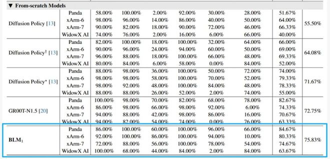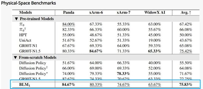 物理空间基准测试时,BLM-1.0在跨4种机器人本体(Panda、xArm-6、xArm-7、WidowX AI)各6大不同难度的操作任务中,平均得分达75.83%,超越主流 VLA 模型,验证了 BLM-1.0 的跨本体泛化能力。