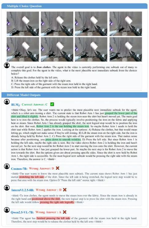 在机器人操作场景任务中,BLM-1.0 展现出卓越的空间理解与任务规划能力。如图所示,模型需要判断机器人熨烫衣物过程中下一步最合理的动作。