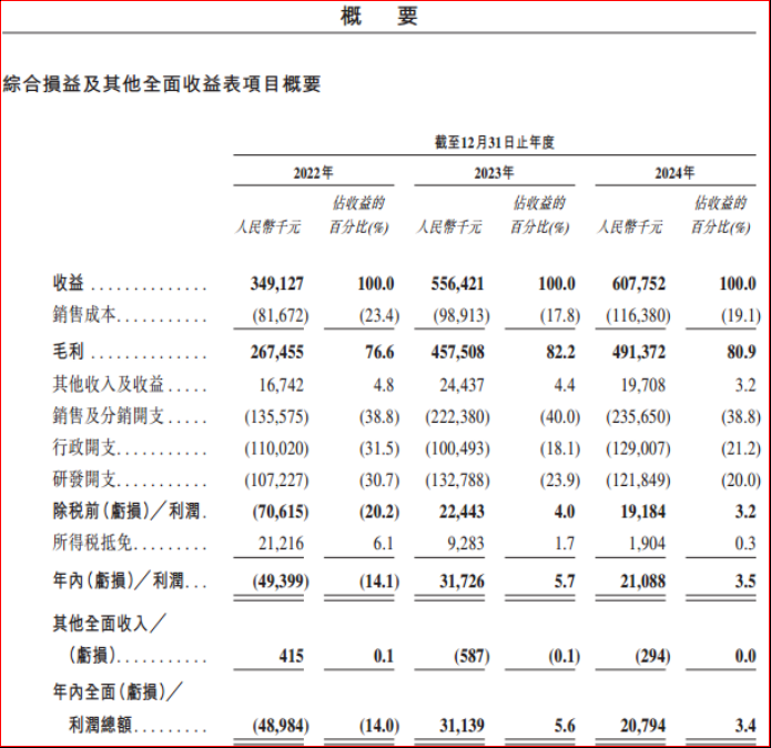 药物管线的拓展与销量的增加,表现为公司业绩的快速增长。具体来看,公司的营业收益从2022年的人民币3.49亿元增长至2024年的人民币6.08亿元,年复合增长率达31.9%;同期毛利由人民币2.68亿元提升至4.91亿元,盈利能力持续增强。2023年及2024年,公司分别实现利润人民币0.32亿元及0.21亿元;2025年前三个月利润达0.13亿元,净利润率升至9.4%,体现出良好的成本控制与运营效率。