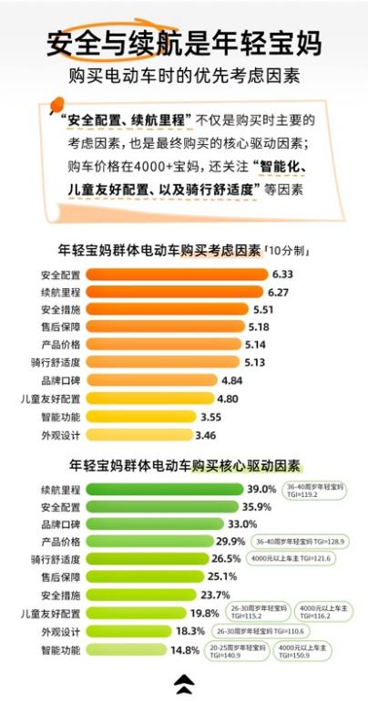 根据宝宝树联合发布的《2025年年轻宝妈电动车出行白皮书》显示,从购车动机来看,出行灵活性强、载人载物实用与经济性是妈妈群体选择电动车的三大主要原因。在选购过程中,车辆安全性能与续航表现成为最关键决策因素,刹车灵敏度、防盗设计和照明系统等基础配置受到广泛关注。与此同时,智能化功能与车辆外观正成为品牌差异化的重要方向,年龄较轻的妈妈对外观个性与科技交互表现出更浓厚兴趣。