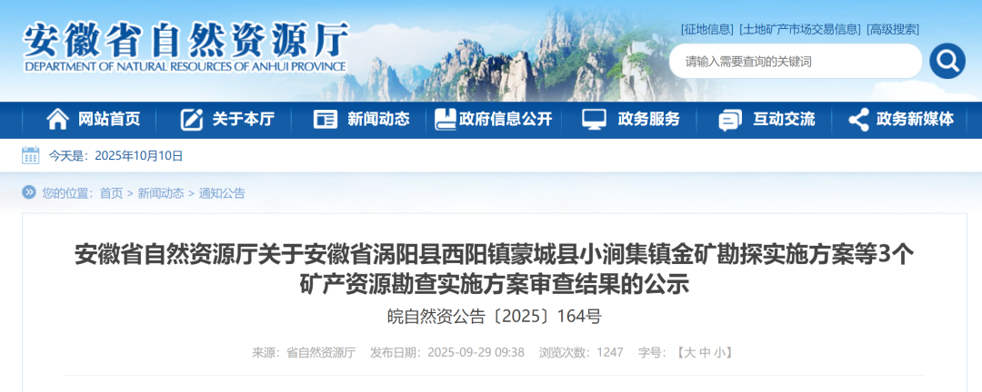 近日,安徽省自然资源厅官网发布关于安徽省涡阳县西阳镇蒙城县小涧集镇金矿勘探实施方案等3个矿产资源勘查实施方案审查结果的公示。