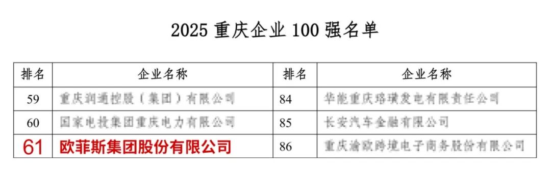 近日,2025重庆企业100强与重庆服务业企业100强榜单如期发布,欧菲斯集团股份有限公司再度双双入围,至此已实现连续8年荣登双百强的殊荣。这份成绩不仅是企业稳健发展的佐证,更折射出重庆企业高质量发展的鲜明底色。