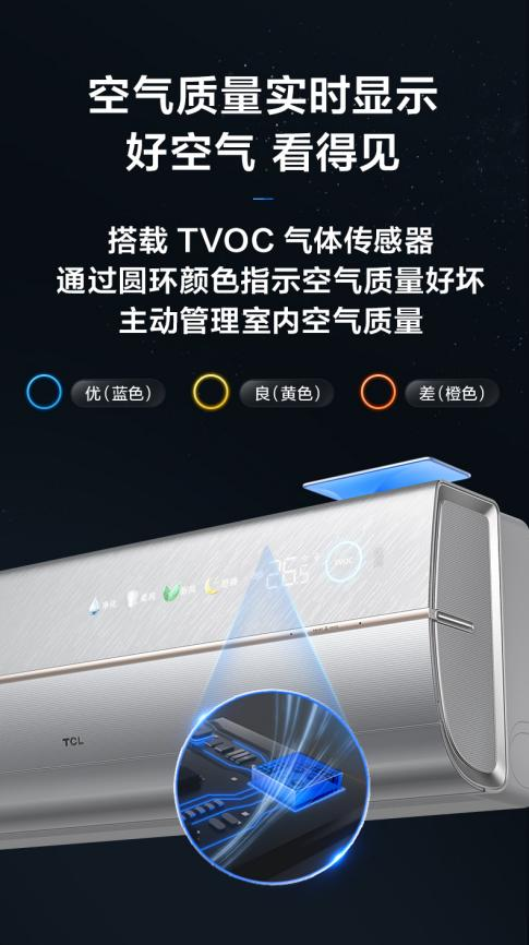 此外,TCL小蓝翼C7新风空调拥有50m3/h澎湃新风,能够一键换新全屋空气。在空气质量保障方面,TCL小蓝翼C7新风空调搭载TVOC气体传感器,通过圆环颜色指示空气质量好坏,实时检测空气质量,并智能开启或关闭新风功能,实现对好空气的主动管理。此外,还具备智慧生态互联功能,支持华为、苹果等第三方生态,可远程操控,实时查看空调运行状态,方便且快捷。