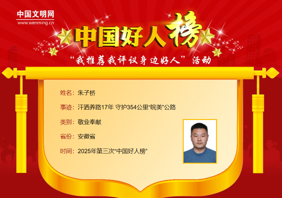 蚌埠发布客户端讯(融媒体记者 周芳林 谢祖武)10月15日,中央精神文明建设办公室发布2025年第三次“中国好人榜”, 蚌埠市蚌固一级公路养路工人朱子桥荣登榜单。