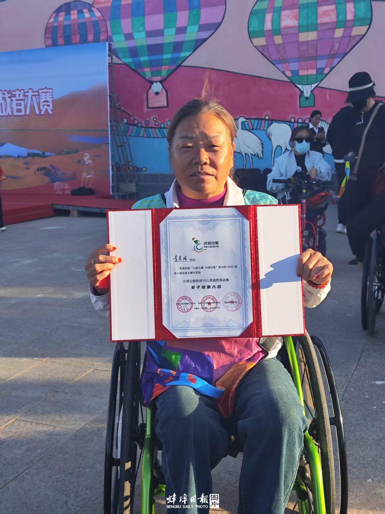 在女子项目赛场,蚌埠市运动员李荣玲成为 “双料功臣”。在女子组沙漠轮椅拔河赛中,她凭借精准技巧与稳定爆发力,带领团队一路突围,最终斩获亚军,用协作与力量诠释体育精神;转战女子组沙漠公路十公里轮椅竞技赛场,面对沙丘起伏、风沙扑面的复杂环境,她咬牙克服体力极限,坚持完成全程并获得第六名,坚韧身影赢得现场观众阵阵掌声。
