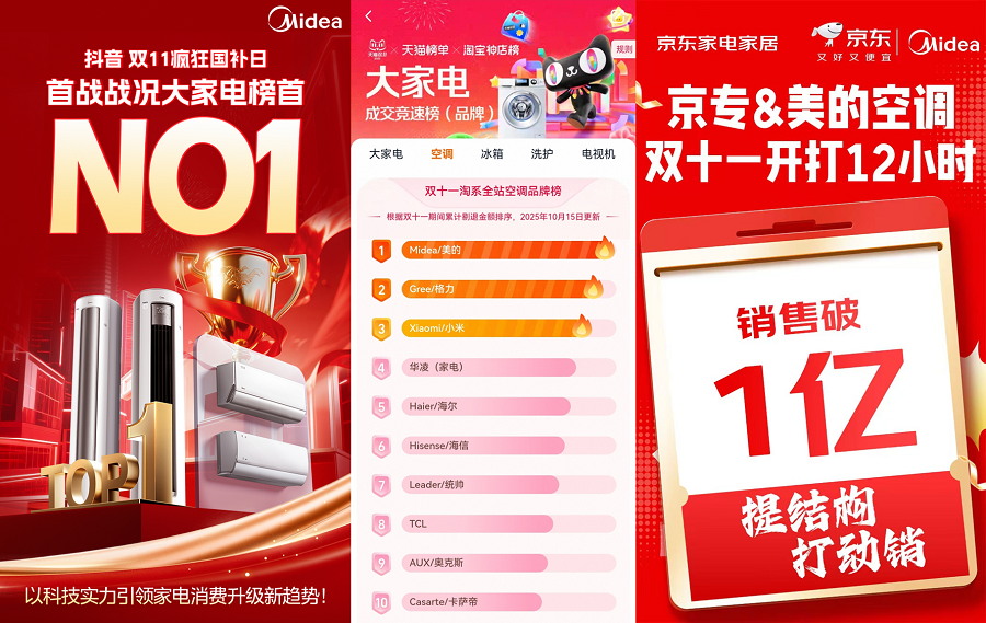 双十一开场第一轮,美的空调又火了一把。天猫双十一空调竞速榜上,美的空调稳居品牌榜第一;抖音“疯狂国补日”活动中,美的空调拿下大家电榜首;京东专卖店的首开12小时里,销售额突破1亿元。无论哪个平台,榜单都有一个共同的名字——美的。
