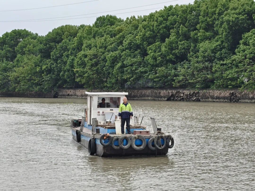 驾着保洁船驶过