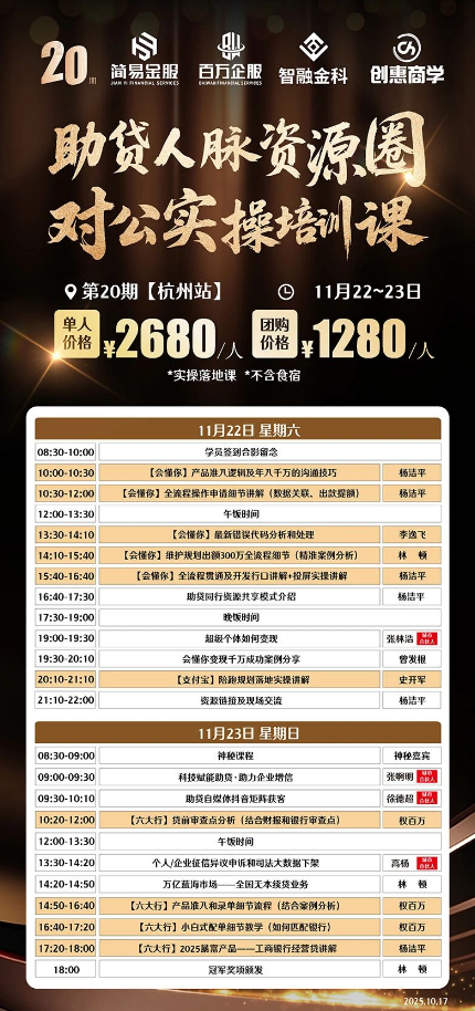 学习从无终点,人脉更需久酿。下一站,11 月 22-23 日第20期交流课杭州站,简易金服邀你继续同行!在这里,既能学产品实操,又能链接全国泛金融资源,打破信息差屏障。诚盼每一位想精进业务、攒实人脉的助贷人,共赴杭州,一起拿资源、拿结果!