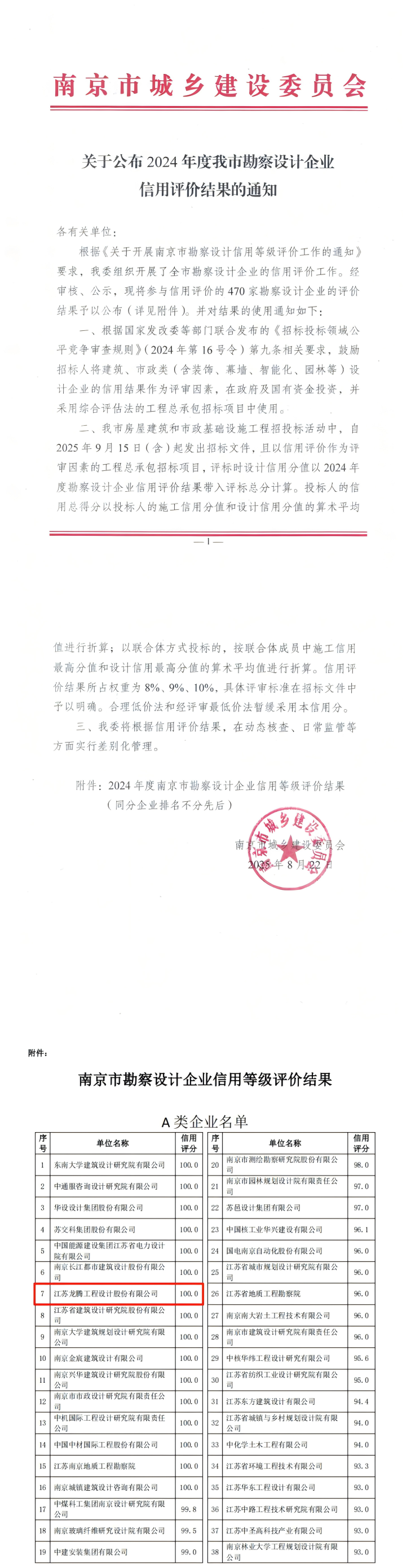 近日,南京市城乡建设委员会公布2024年度南京市勘察设计企业信用评价结果,江苏龙腾工程设计股份有限公司凭借卓越的综合实力、规范的运营管理和良好的市场信誉,以满分成绩获评最高等级——A类企业。这是对龙腾设计长期坚持诚信经营、高质量发展的高度认可,也标志着公司在行业信用体系建设中走在了最前列。