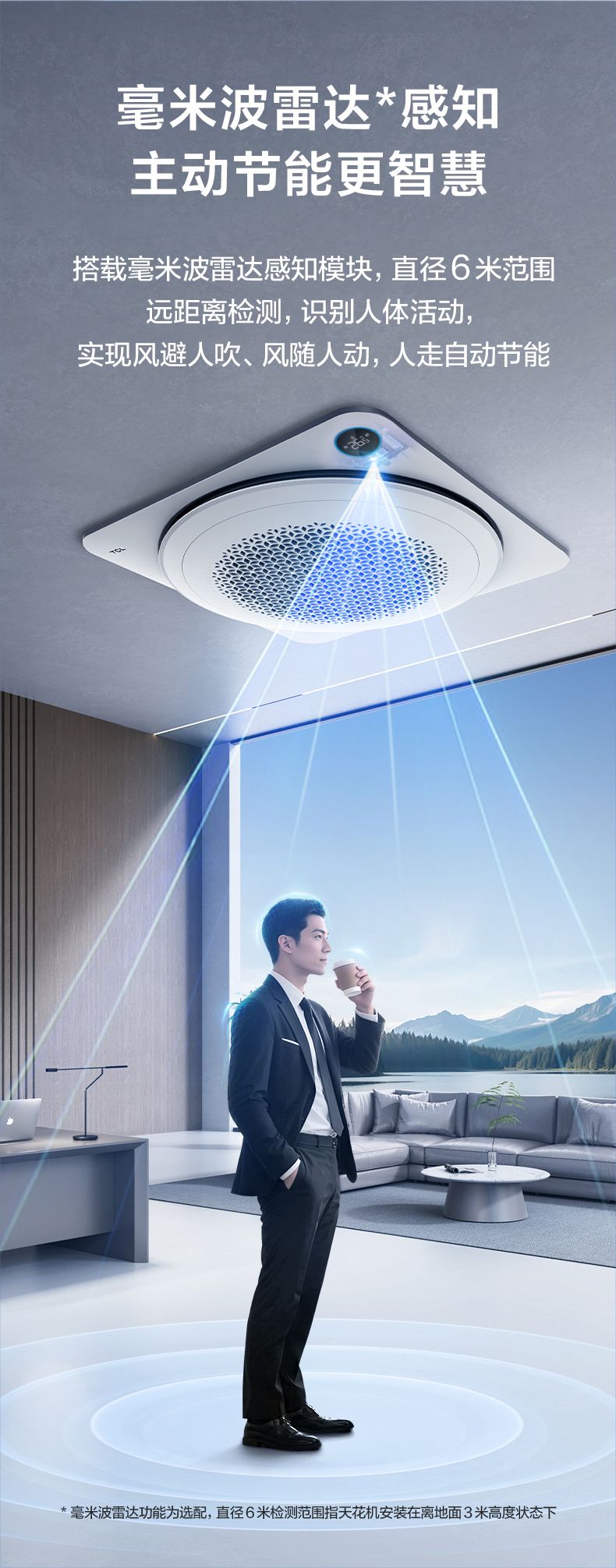 值得关注的是,TCL小蓝翼天花机搭载了毫米波雷达感知模块(选配模块),能够在直径6米范围内远距离识别人体活动,实现风避人吹、风随人动。当人离开房间时,空调会自动进入节能模式,实现无需手动、感知环境的主动节能,让空调更加智慧高效。