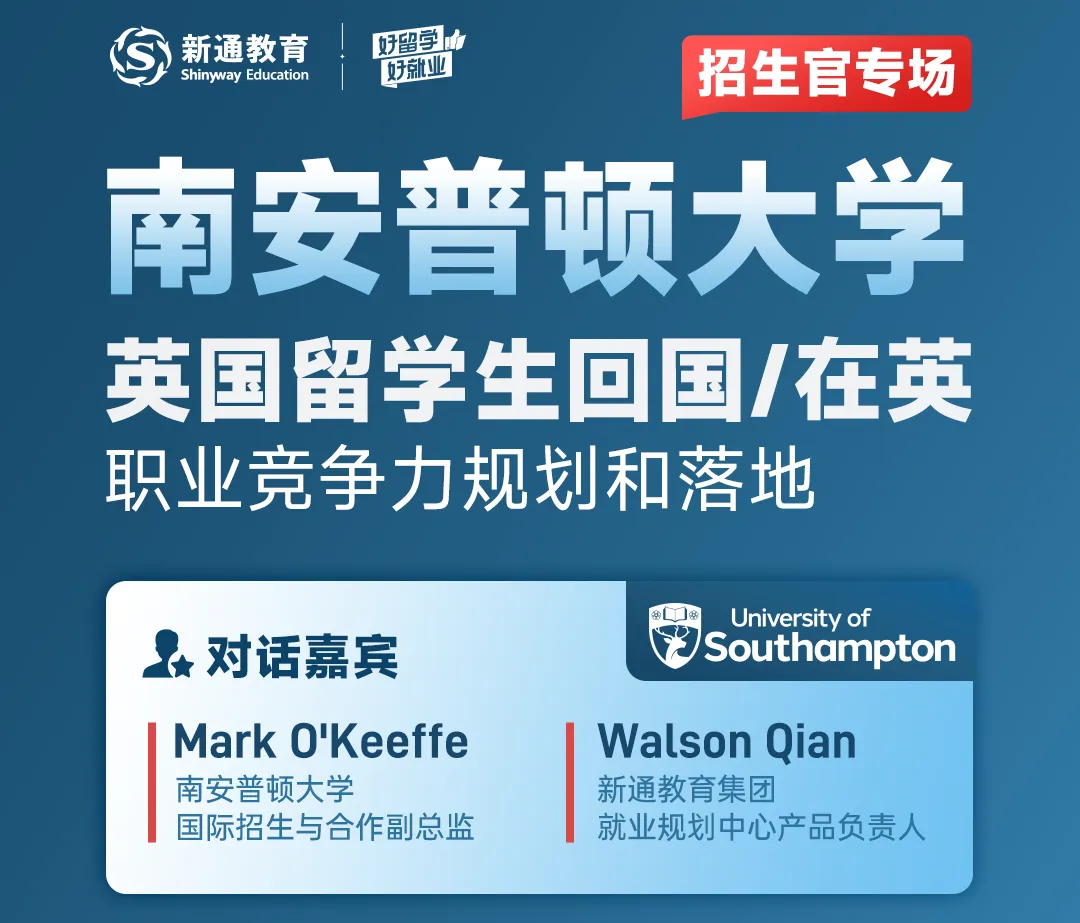 南安普顿国际招生与合作副总监Mark O'Keeffe做客新通直播间,与新通就业规划中心产品负责人Walson一同展开了持续90分钟的深度对谈,为学子带来一场思想的盛宴。