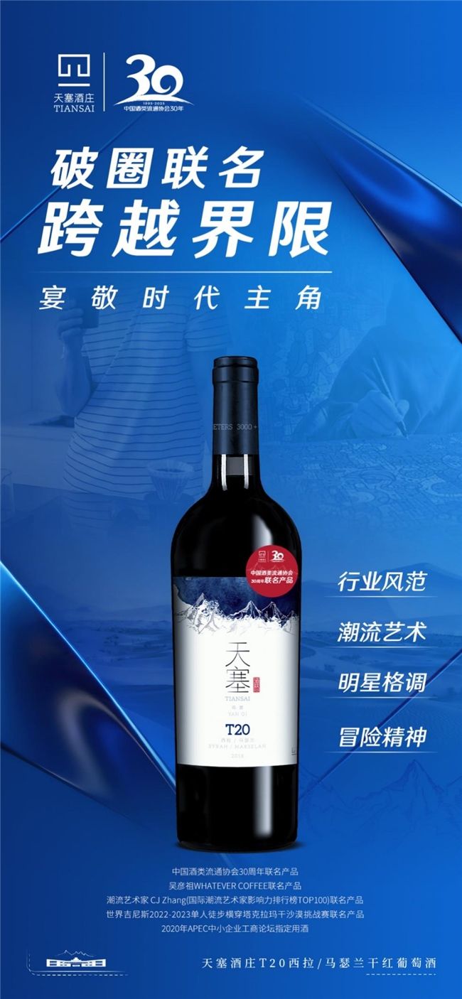 这并非天塞酒庄T20西拉/马瑟兰干红葡萄酒首次尝试跨界联名。今年年初,就曾与国际影星吴彦祖创办的咖啡品牌WHATEVER COFFEE推出联名礼盒。另外,联名“国际潮流艺术家影响力排行榜TOP100”潮流艺术家 CJ Zhang推出“上岸SUCCESS”;推出世界吉尼斯2022-2023单人徒步横穿塔克拉玛干沙漠挑战赛联名产品,作为活动官方指定用酒,接连亮相启动、出征、庆功仪式。