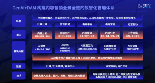 而钛镁AI的一站式社媒矩阵内容运营的GenAI解决方案,正是从“内容工程+受众洞察+标签”搭建内容银行,到“场景匹配+DAM+有效互动”激发UGC,来助力品牌多层面构建全景全链的内容“智慧”运营管理体系,其每个流转环节都围绕“用户需求” 和“数据驱动”展开。