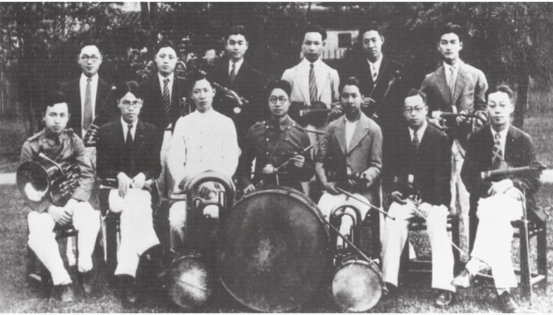 钱学森(前左一)在交大铜管乐队合影。