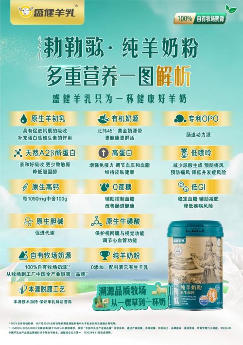 市场表现是产品价值的最佳印证。盛健羊乳另外一款低GI有机纯羊奶粉自上市以来,便迅速获得市场高度认可,并于2023-2024年连续两年斩获中国有机羊奶粉全国销量第一的佳绩。其凭借低嘌呤、低GI、有机三重权威认证,成为当下消费者的健康新选择。与此同时,盛健羊乳针对儿童、女性、中老年等群体定制的系列产品,也凭借精准的营养配比和卓越品质,收获了广泛的消费口碑,充分体现了消费者对盛健羊乳创新产品的深度信赖。