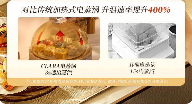 随着都市生活节奏加快,高效与健康成为饮食需求的核心矛盾。传统蒸锅升温慢、冷凝水破坏口感、塑料材质安全隐患等问题长期困扰消费者。CLARA品牌基于一种不妥协于品质的效率,用“高温速热” 重新定义高效与健康并存的烹饪哲学的理念,推出行业首款圆形小巨蛋电蒸锅,以3秒高温瞬蒸技术,始于对用户真实需求的洞察与康宁合作,重新定义高端速热厨电的标准