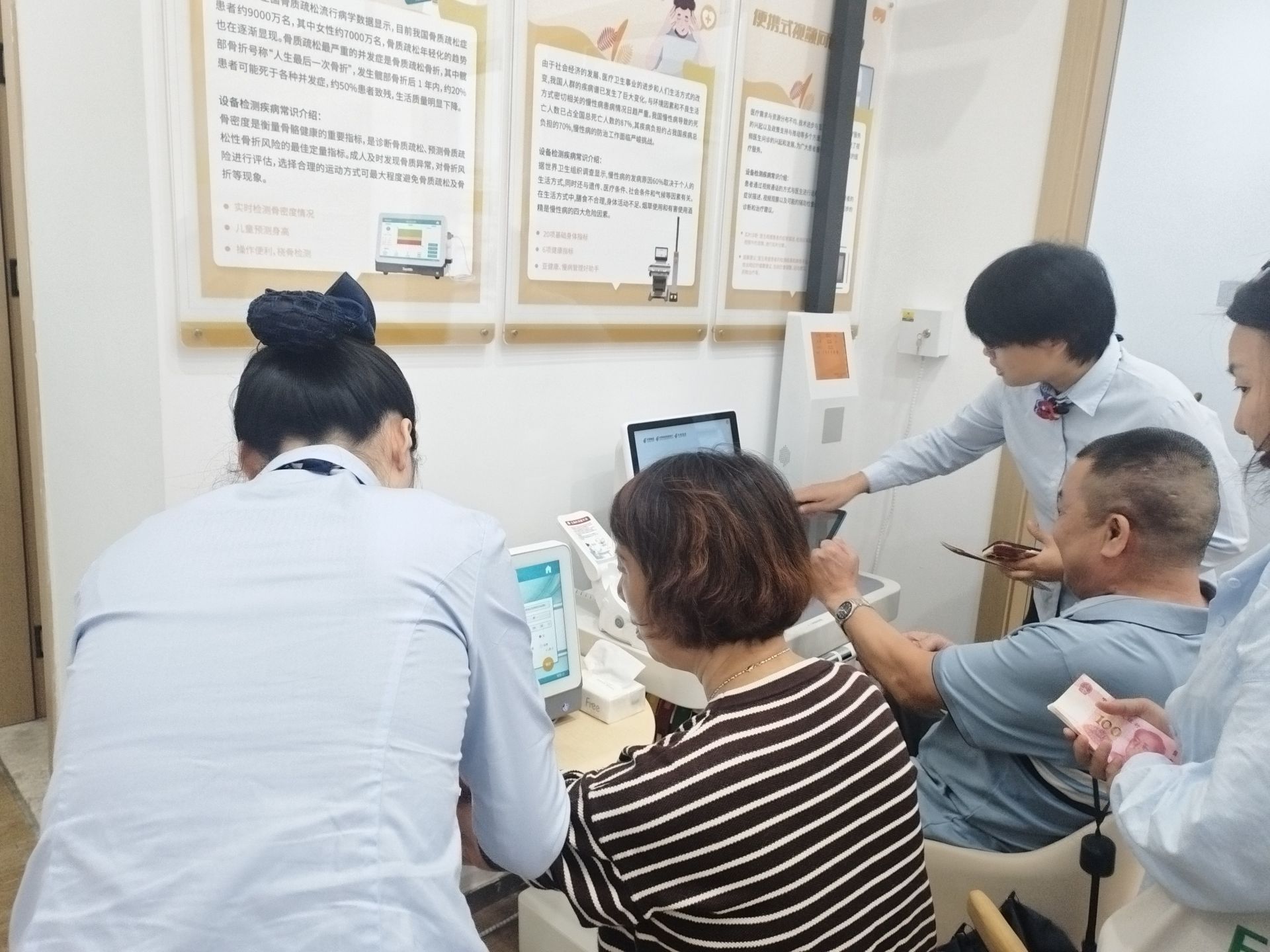 活动当日,支行网点洋溢着温馨融洽的氛围。工作人员热情引导前来办理业务的老年客户参与体验。在网点精心打造的“健康驿站”内,血压计、血糖仪、骨密度检测仪等基础健康设备一应俱全。活动期间,支行安排了专人为老年客户提供免费的血压、骨密度等基础健康指标检测服务。工作人员不仅耐心操作、细致记录数据,还针对检测结果进行专业解读,并贴心提醒他们关注日常健康波动,将关怀落到实处。