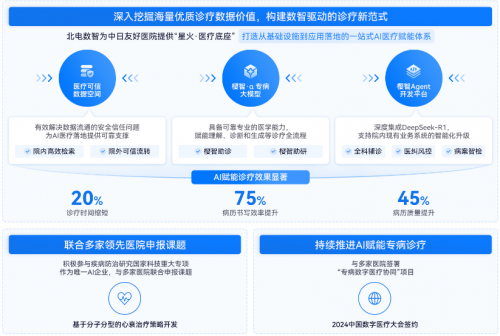 此前,北电数智还借助“星火・医疗底座”,与中日友好医院合作打造“中日樱智Agent开发平台”,实现了模型引擎、知识库管理、工作流设计等能力在院内的落地,支持院内现有业务系统的智能化AI化升级。此外,双方还合作发布“樱智大模型”系列,针对皮肤科领域的“樱智·α专病大模型”已率先实现落地应用。基于“樱智・a专病模型”打造的智能体助使诊疗时间缩短20%,提升病历书写效率75%,病历质量提升45%,显著降低了医生工作负荷,同时让患者获得更高效、优质的诊疗服务,真正为医疗行业的智能化转型提供了可复制的标杆案例。