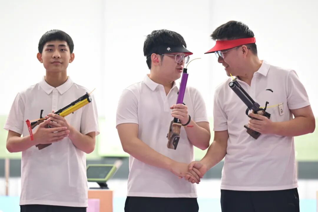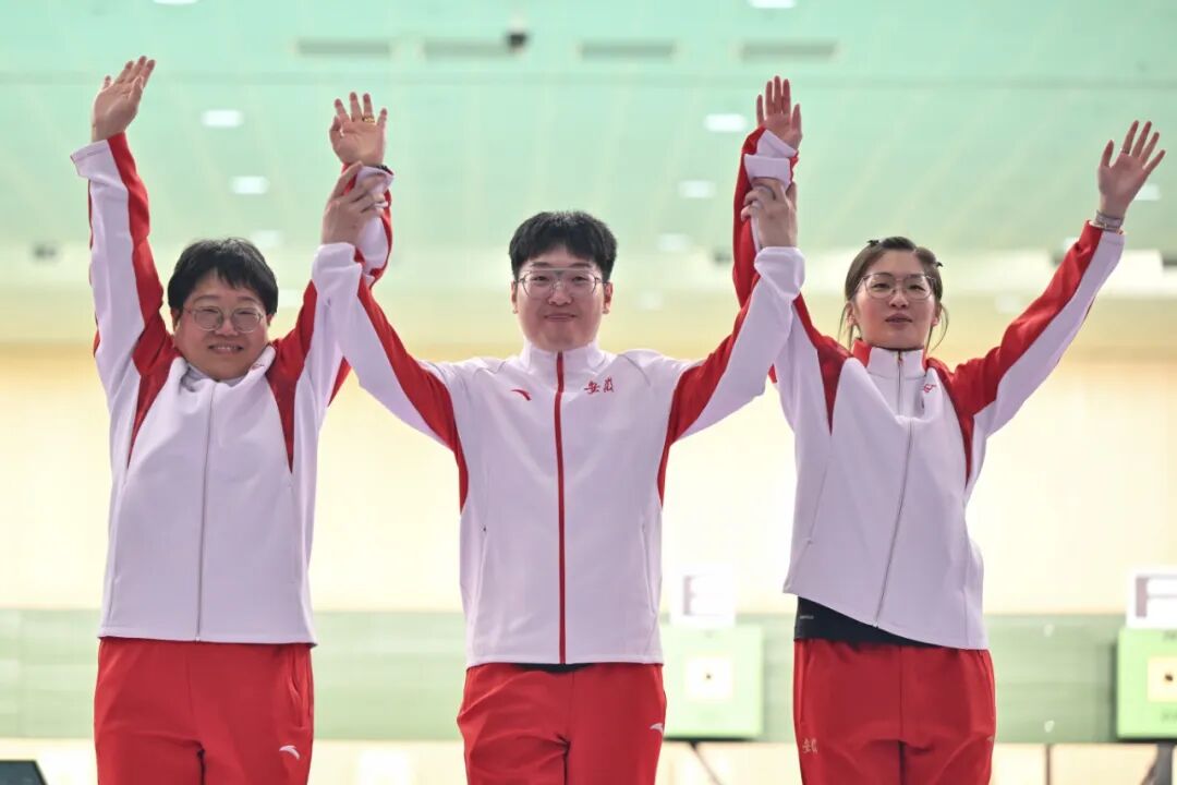 安徽选手张浩、胡凯、刘子扬(从右至左)在射击男子10米气手枪团体决赛后庆祝。新华社记者 丁磊 摄