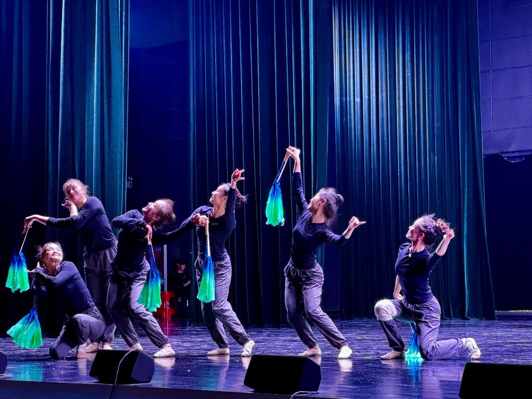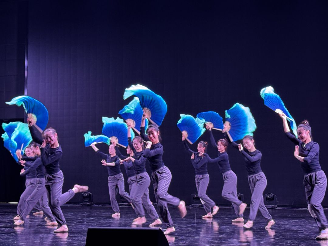 舞台之上,灯光渐起,舞者身着素雅服饰,身姿如淮河浪花般舒展。《家在淮河边》借助音、舞、诗、画艺术形式展淮河之美,传文化之魂,力求实现内容与形式、传统与现代的双向共呜。排练现场,现代舞与传统花鼓灯元素交融碰撞,灯光璀璨中,舞者们用充满力量的舞姿展现新时代蚌埠人的奋斗身影,欢声笑语里洋溢着幸福生活的鲜活气息,将时代美、奋斗美与幸福美推向高潮。