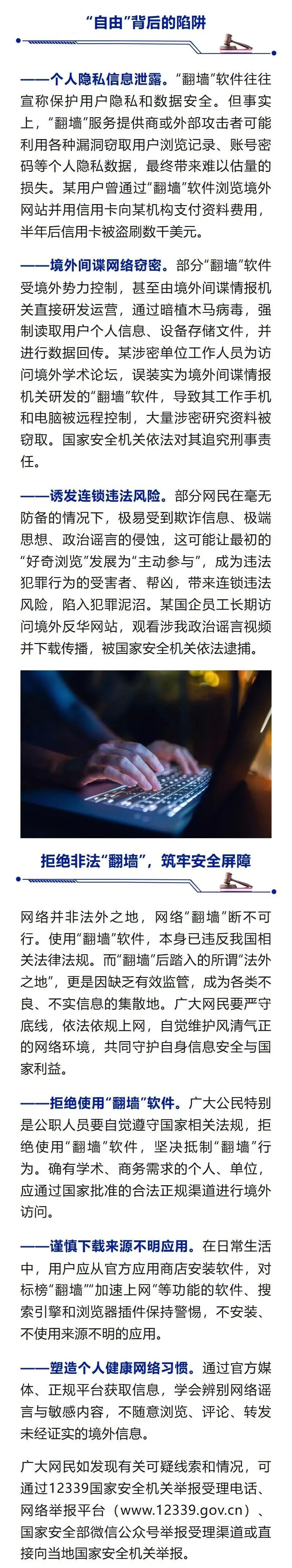 在移动互联网时代,通过互联网获取信息资讯已成为我们了解外部世界的普遍方式,但个别网民法律和风险防范意识淡薄,违法使用“翻墙”软件(俗称VPN或“梯子”)访问境外网站、注册账号以及参与群组聊天。贪图猎奇不仅可能带来个人信息安全风险,甚至影响国家安全和社会稳定。