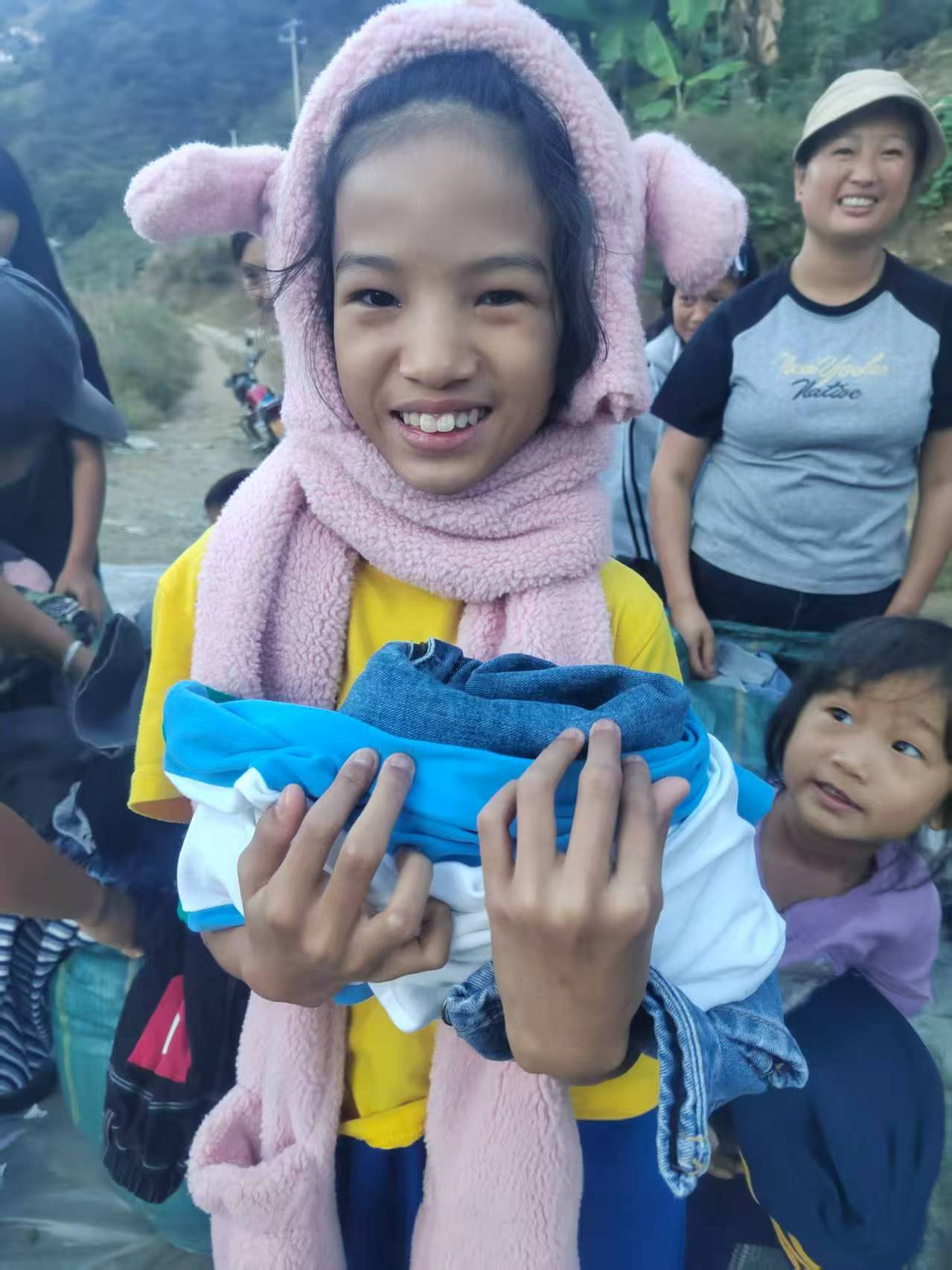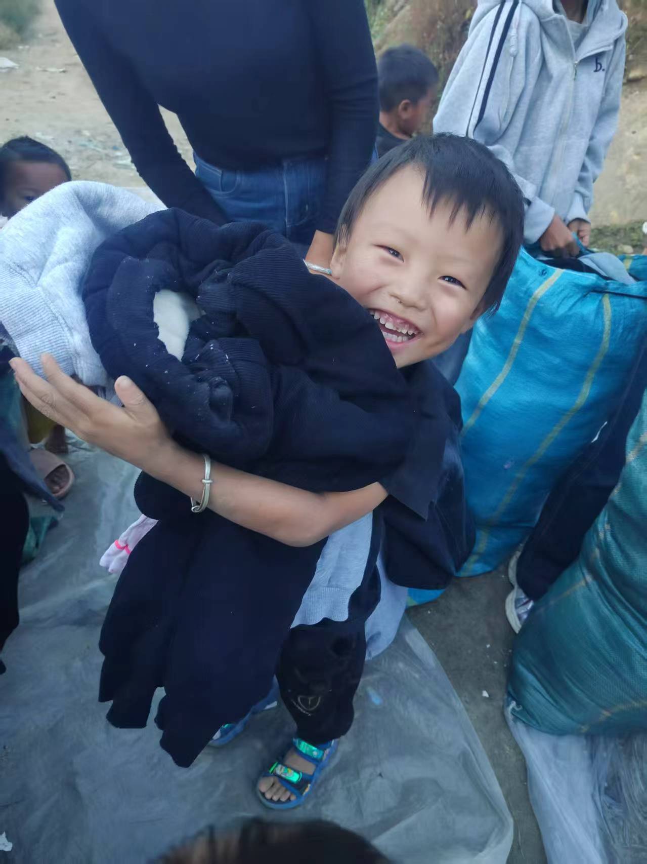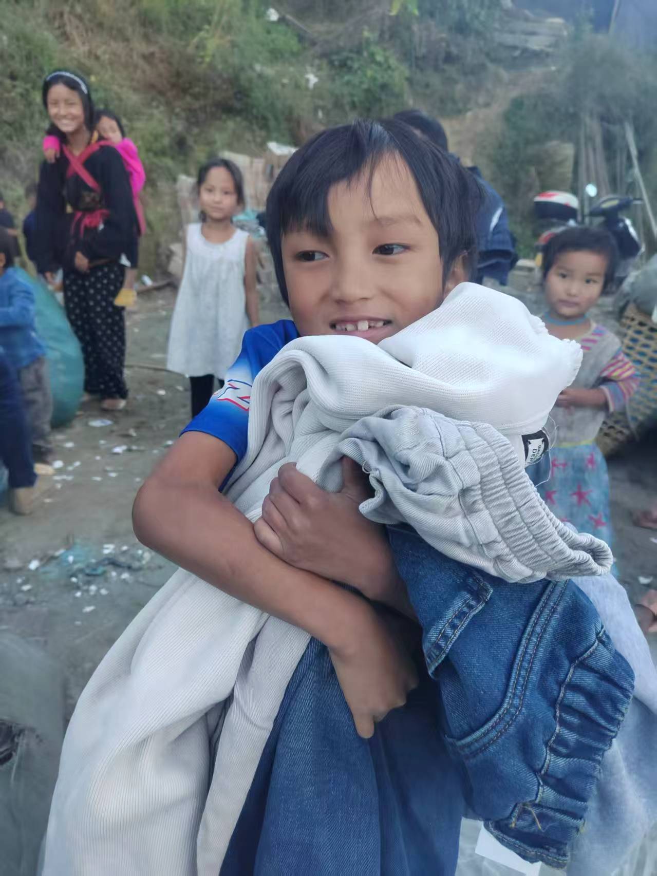 当天,在福贡县子里甲乡亚谷村委会及架科村的发放现场,当地志愿者施学杰与村民们一起,将来自蚌埠的棉衣、棉被、棉袜等物资逐一清点、分类,根据村民家庭情况按需分配。年过七旬的独居老人李阿婆接过厚实的军大衣,反复摩挲着面料,用不太流利的汉语念叨:“暖和,太感谢远方的好心人!” 村里的孩子们捧着崭新的羽绒服和棉袜,迫不及待地试穿起来,奔跑的身影为冬日的山村增添了生机与暖意。