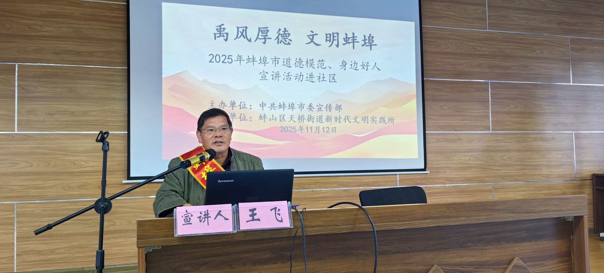蚌埠发布客户端讯(记者 周芳林 实习生 周子彤 通讯员 何本文 文/图)近日,由中共蚌埠市委宣传部主办的“禹风厚德 文明蚌埠”——2025年蚌埠市道德模范、身边好人宣讲活动,走进蚌山区天桥街道新时代文明实践所,安徽省“百名孝星”、蚌埠好人王飞为现场观众带来了一场直抵心灵的分享。