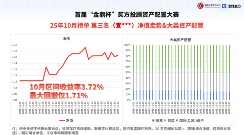 紧随其后的亚军“黄***”(参赛组合名),以3.94%收益率展现了“抗波动优先”的配置思路。从大赛披露及直播解析可知,该参赛组合核心理念为“用低相关性资产对冲市场分化”——聚焦另类资产(如商品、黄金相关品种)与QDII资产(美股、海外市场基金),通过两类资产与A股的弱关联特性,规避10月科技领涨、板块轮动过快的投资风险。不同于单一市场配置,该参赛组合不追求某类资产的超额收益,而是通过另类资产的抗通胀属性、QDII资产的全球市场敞口,在震荡市中保持净值稳定。大赛邀请的直播嘉宾点评指出,这类策略尤其适配追求“稳健增值”的投资者,在板块分化加剧的行情中,能有效降低单一市场波动对组合的冲击。