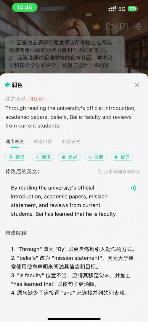 如果你是考研党,它能帮你7天速成复试口语,让你在面试现场从容应对导师提问;如果你是职场人,它的商务英语场景能让你在国际会议上侃侃而谈;如果你是留学生,它的学术表达训练能让你在课堂讨论中脱颖而出。