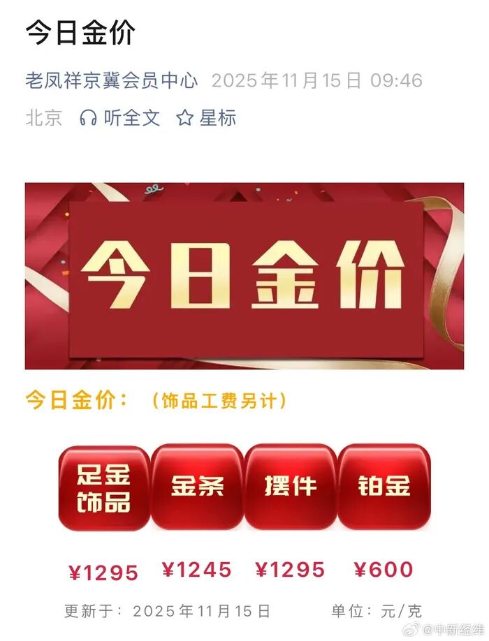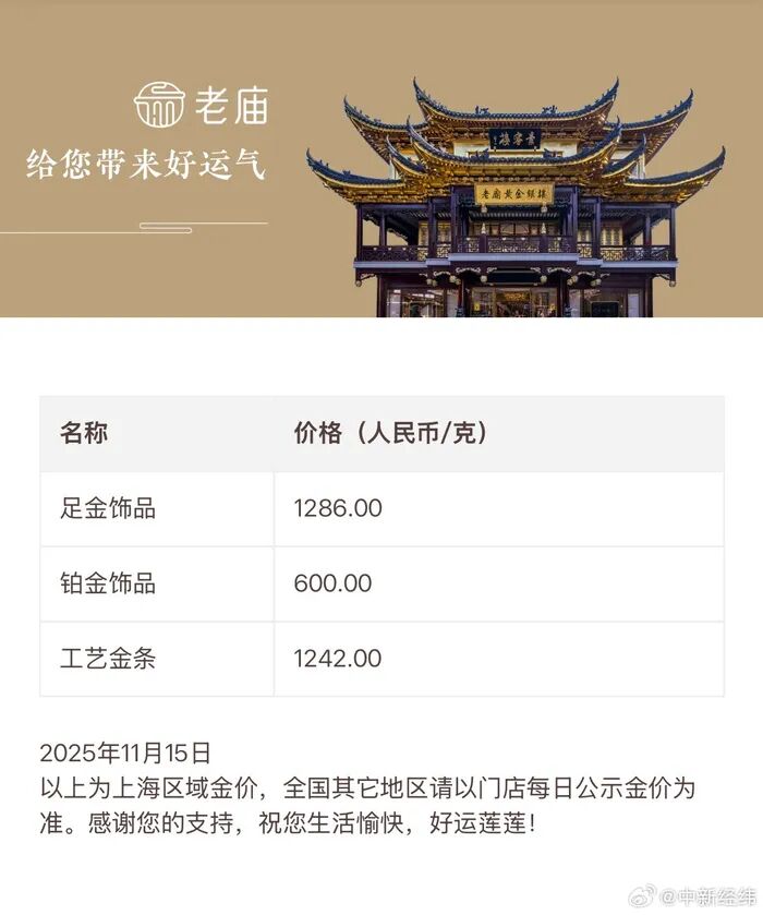 国内品牌金饰价格随之调整,记者查询到,周生生足金饰品报价1295元/克,较昨日1328元下跌33元/克;老庙黄金足金饰品报价1286元/克,较昨日1315元/克下跌29元/克;老凤祥足金饰品报价1295元/克,较昨日1322元下跌27元/克。