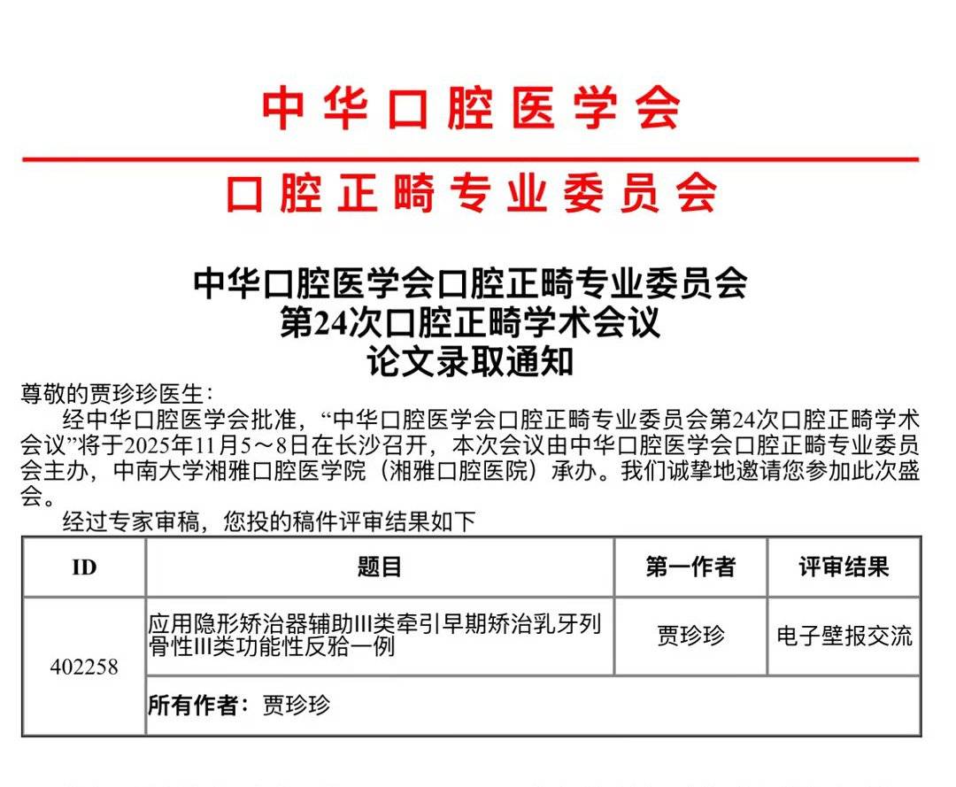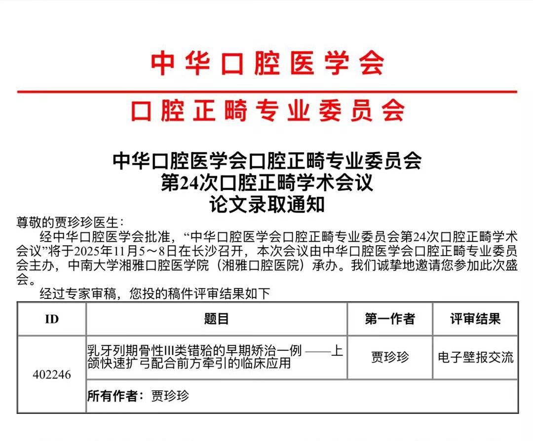 贾珍珍医生从医10余年,深耕儿童青少年早期矫治与成人复杂错颌畸形矫治领域,此次4篇高质量论文被大会正式收录。