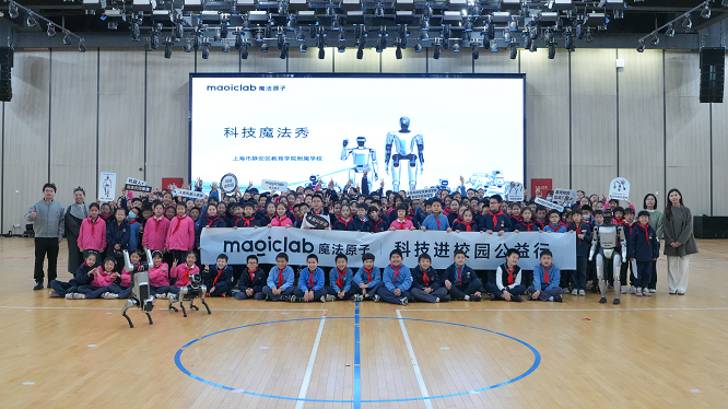 11月17日,天气微凉,魔法原子的机器人“天团”却带着满满活力现身上海市静安区教育学院附属学校科技节,用丝滑的舞步和精准的节奏,带来了一场别开生面的沉浸式表演,也让前沿科技悄悄“跳”进了课堂,在孩子们心中种下了一颗发着光的科技种子。