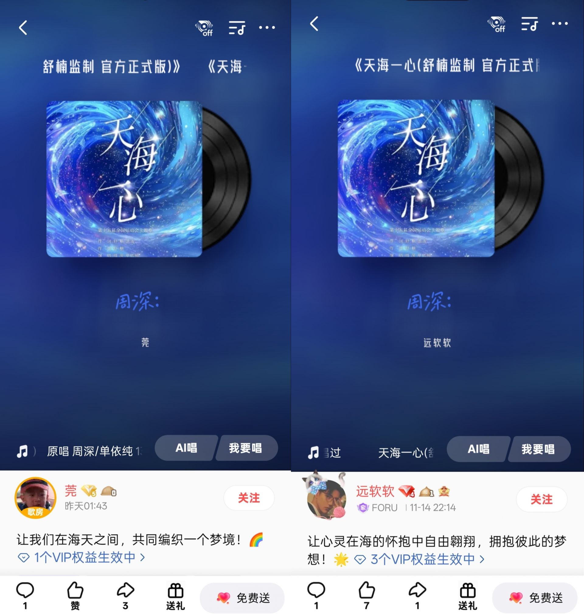自11月9日在十五运开幕式首唱之后,《天海一心》的传唱度迅速提升,不少网友纷纷来到全民K歌平台,尝试翻唱这首刚柔并济的歌曲。例如,K歌网友“莞”在“VIP-通透饱满音效”的加持下演绎《天海一心》,声音呈现出如水滴般的清澈质感,将周深式的空灵与纯净展现得细腻动人;另一位K歌网友则“远软软”使用“VIP-人声增强”音效让整体演唱更具力量感与穿透力,将歌曲奔涌向海的恢宏意境诠释得更加饱满有张力。