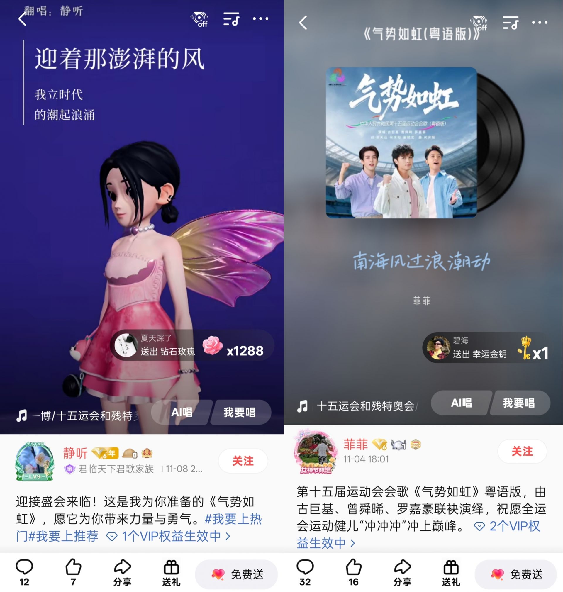 除《天海一心》外,本届全运会会歌《气势如虹》也在全民K歌平台掀起了翻唱热潮。例如,K歌网友“静听”利用“VIP-高质音质”翻唱《气势如虹》,高解析度的声场加持下原曲高燃的旋律更加昂扬;K歌网友“菲菲”则用“VIP-远场音质”翻唱《气势如虹(粤语版)》,营造出如现场合唱般的空间感与纵深,让歌曲的热烈氛围更加立体。