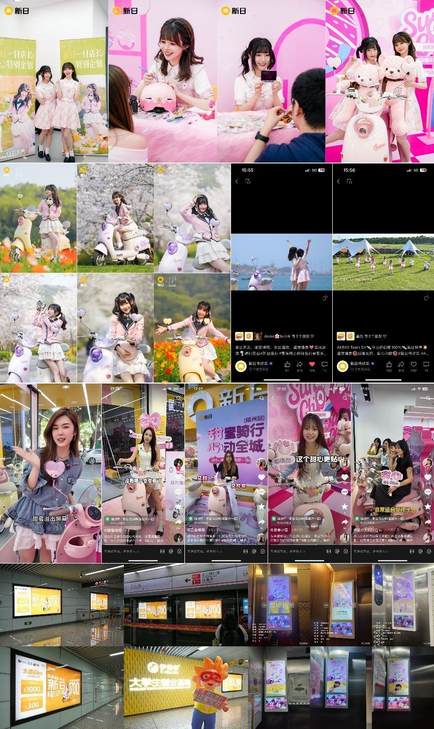 新日将门店打造为“打卡式体验空间”,在全国门店设置「梦想6/甜心主题区」,吸引本地网红博主前来打卡合影。此外,新日携手AKB48 Team SH国民女团打造一系列沉浸式互动现场,担任“一日店长”、举办“粉丝握手会”、拍摄“夏日骑行大片”“海边专属MV”,与粉丝、用户互动交流,让代言不再是海报上的形象,而是可触碰的真实陪伴。并整合抖音、小红书、户外媒体、达人等资源辐射年轻群体,为甜心带来了亿级曝光,