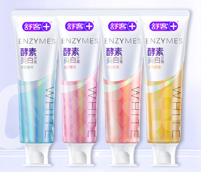 舒客精研亮白酵素牙膏以硬核科技重塑口腔美白新标杆。产品搭载双酵素体系与超酵因子协同专利技术(专利号:ZL201710131247.0),通过木瓜蛋白酶、葡聚糖酶与超酵活性因子的协同作用,直击牙齿深层色素沉积,美白效果较普通牙膏提升3倍。经SGS权威机构百人实测验证,连续使用14天即可让牙齿提升3个美白色阶,同时采用高级软性磨料,在高效清洁牙渍的同时呵护牙釉质,避免刺激敏感。自2018年面市以来,该产品全网累计销售突破4000万支,横扫天猫金妆奖等多项行业大奖。