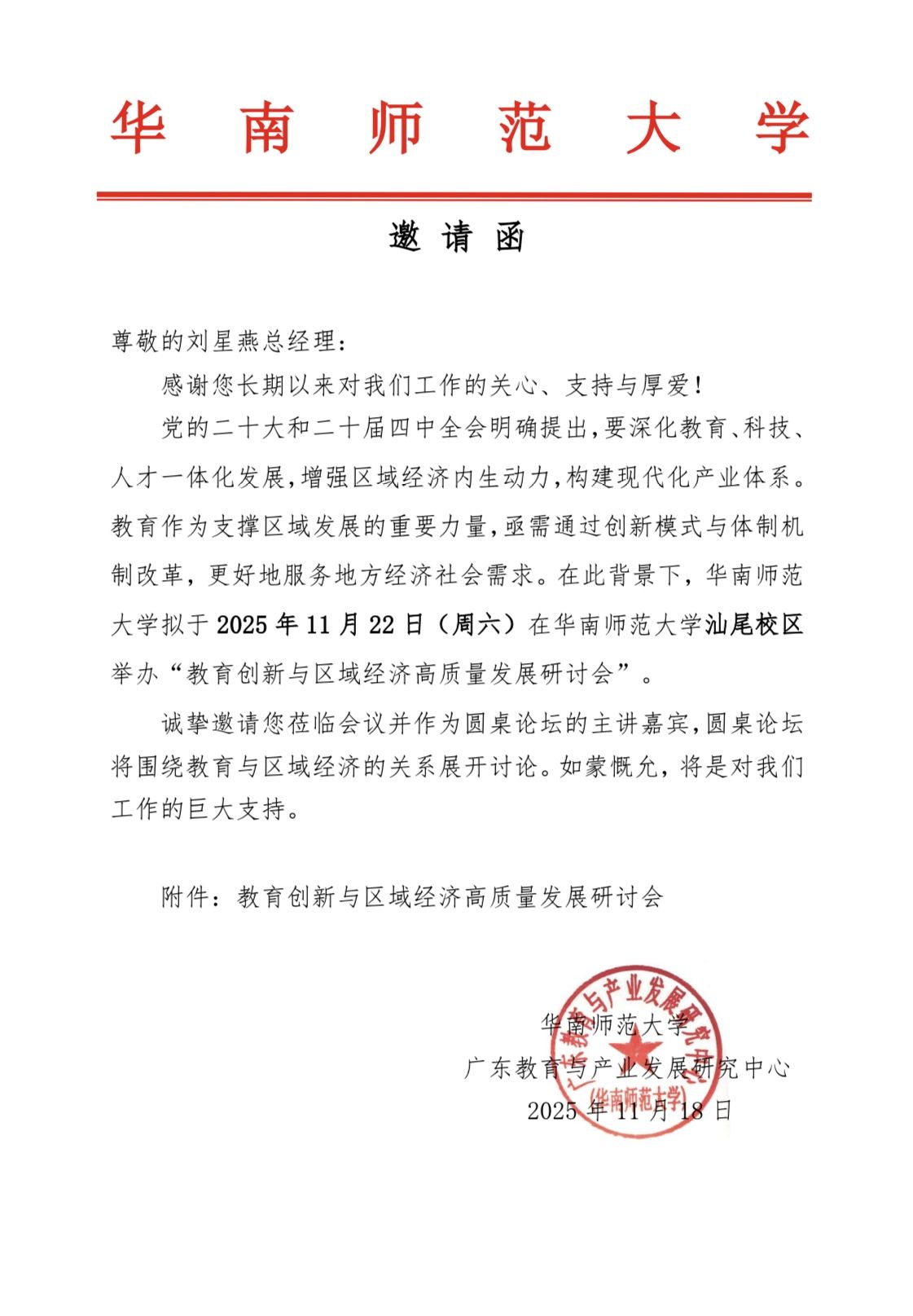 2025年11月22日,由华南师范大学与汕尾市人民政府联合主办的“教育创新与区域经济高质量发展研讨会”在华南师范大学汕尾校区隆重举行。逸马教育总经理刘星燕女士受邀出席,并在圆桌论坛环节就“教育与区域经济的关系”与高校、政府和产业界专家展开深入对话,系统分享逸马在人才共育与生态共建方面的实战经验与创新路径。