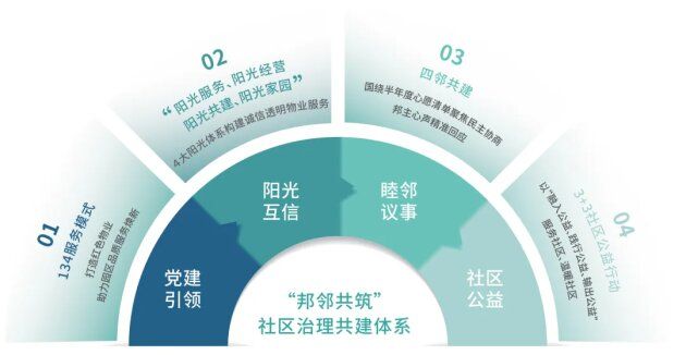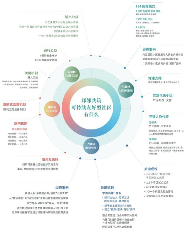 此次获奖的“邦邻共筑”社区治理模式优秀案例,正是“可持续友好型社区”理念在治理维度的深度实践与完美诠释。它将社会治理“共建共治共享”的总体理念在社区场域中落地延申,通过与多元主体间的“共治、共信、共创、共享”的可操作路径,建立起社区服务的信任基础与可信承诺。此体系通过构建“党建引领、阳光互信、睦邻议事、社区公益”四大子品牌,将治理权力从“单向主导”转变为“多元共治”,有效激活社区内生动力。