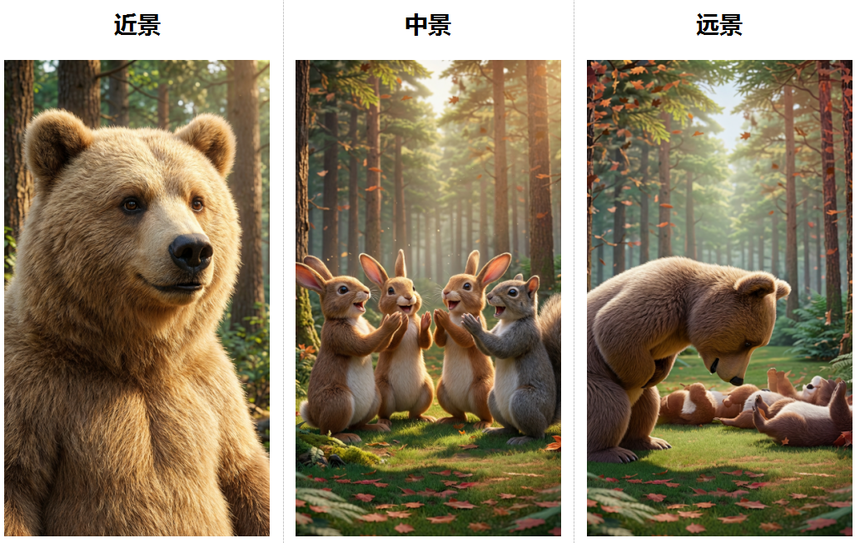 V5.5 的智能化程度还体现在它对模糊信息的理解能力上。即使用户只输入“一只小熊在森林里讲笑话”的简单提示词(Prompt),勾选音频( Audio )和多镜头( Multi-shot )后,AI 就能自动生成具有景别变化、搞笑情绪并搭配匹配笑声的完整片段。镜头骨架、情绪走向都由AI自动搭建,让普通人也能以“导演思维”进行表达。