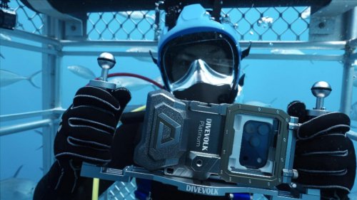 “影视飓风创始人 Tim 正在使用 DIVEVOLK 铂金版防水壳拍摄大白鲨”
