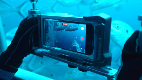 当面对体长近5米、咬合力高达18000牛的深海霸主时,为了在狭窄的海底笼中灵活捕捉画面,探险队选择了最轻便却强大的组合:iPhone + DIVEVOLK 全触控潜水壳。