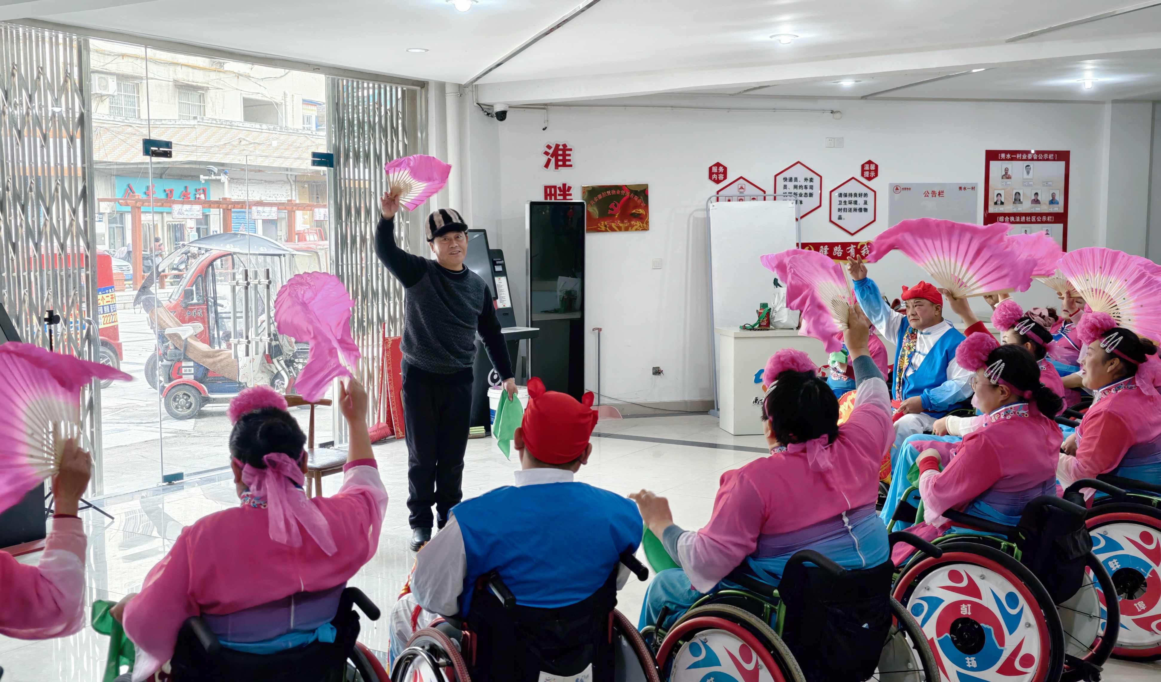 “传统花鼓灯讲究‘放与收、动与静的巧妙结合’,你们用坚韧重构了这种美感。”金明老师现场展示了经典花鼓灯片段,舒展流畅的舞姿与队员们的轮椅舞蹈形成呼应。他动情地说,花鼓灯是淮河边人人可享的文化财富,队员们的坚守让他看到了非遗传承最动人的模样,“今后只要有时间,我一定常来和大家交流,咱们一起把轮椅花鼓灯打磨得更精彩。”