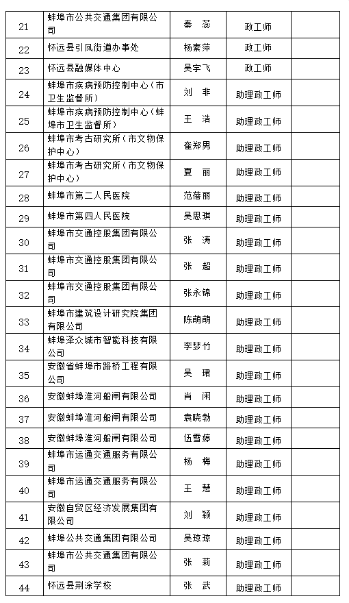 经蚌埠市政工专业职务任职资格评审委员会评审,沈思兵等23名同志通过政工师专业职务任职资格评审,刘非等23名同志通过助理政工师专业职务任职资格评审。根据有关规定,现予以公示,公示时间:2025年12月22日—2025年12月26日。