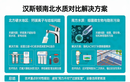 对于南方水质,则更关注细菌、微生物、有机物等隐形污染问题,重点强化ACWST水路除菌模块,确保在管网复杂、二次供水条件多样的情况下,仍能输出安全可靠的饮用水。